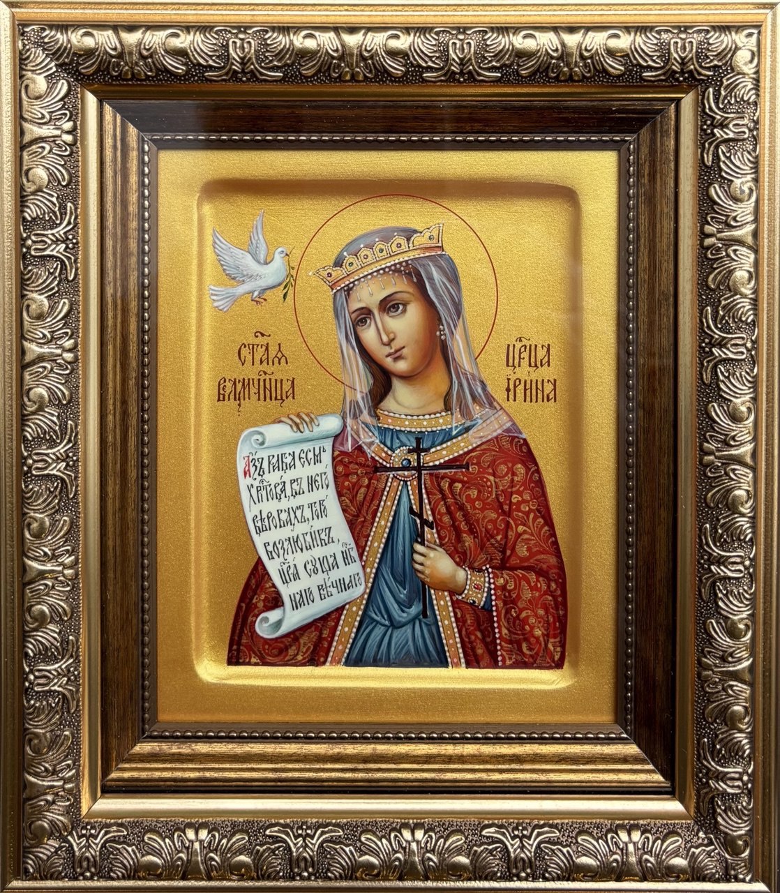 Икона Святая Ирина, размер 17*21 см., липа, ковчег, искусственная позолота, темпера. Монтирована в киот. Выполнено на заказ.